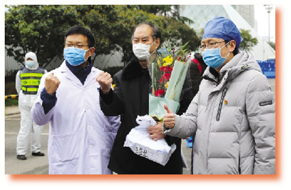③ 3月1日,贵阳市政协委员、贵州省第二批援鄂医疗队领队刘辉(左)与方舱医院治愈患者合影。