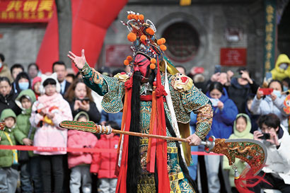 2月23日,在山西省太原市迎泽区庙前街,晋剧非遗代表性传承人武凌云在文化展演活动上表演,吸引了众多游客观看。晋剧是山西省的代表性剧种,于2006年被列入第一批国家级非物质文化遗产名录。 詹 彦 摄