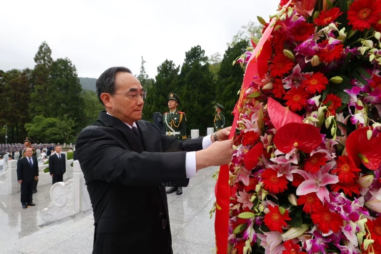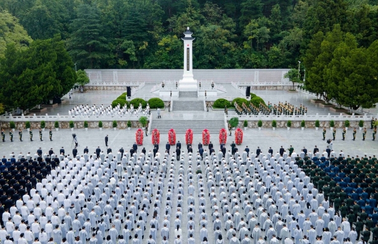 上午10时许,敬献花篮仪式正式开始。卫兵分两列正步行进至纪念碑前整齐伫立。伴随着雄壮激昂的《义勇军进行曲》,全场齐声高唱中华人民共和国国歌。国歌唱毕,全场肃立,向为革命和建设事业英勇献身的英雄烈士默哀。默哀毕,手持鲜花的少先队员面向纪念碑献唱《我们是共产主义接班人》,并致少年先锋队队礼。在深情的《献花曲》中,14名礼兵稳稳抬起花篮,缓步走向纪念碑,将花篮摆放在纪念碑基座上。徐麟走上纪念碑基座,在花篮前驻足凝视,仔细整理花篮缎带。随后,省党政军领导和社会各界代表缓步绕行瞻仰纪念碑,表达对英雄烈士的深情追思和深切缅怀。
