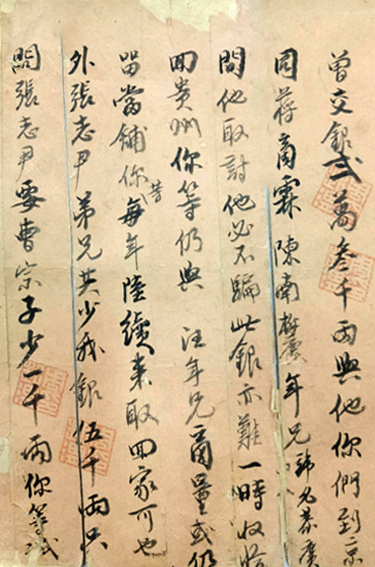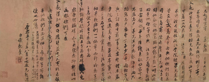 兄起渭字寄,二弟长源,三弟又濂,并诸弟等同览。我病且死不能作楷字寄,父亲、汝等在远不得相见,我死之后,汝等见字可着一二人来京,汪年兄讳澐,号千波,其弟讳漋,今现任浙江学院,彼弟兄处,我曾交银贰万叁千两与他,你们到京同蒋商霖、陈南柳、鹿年兄讳名恭广,问他取讨,他必不骗,此银亦难一时收恰回贵州,你等仍与汪年兄商量,或仍留当铺,你等每年陆续来取回家可也。外张志尹弟兄共少我银五千两,只问张志尹要。曹宗子少一千两,你等试与之讨。我生前心事,只要修理本处寺院及造高车桥,并在本寨以白米三百石置义仓,义之法我另有详细单款,你们一一依单而行,成,我生前之志便了。至于我病,八分为王事驰驱劳碌所致,五分为恶妇□氏凶狠无理极,妇人之恶事使我抑郁结此病根,你们可告父亲得知。随琴并家人卖旺者俱各遗出,□□我已分附了□□□贵州你们不必留他,他非你等所能使也,此嘱。获封图书是我平时寄家书者,此书寄后,图书已□了,再有字非此图书勿信。